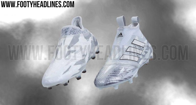 Das wiederkehrende Motiv der Adidas Camouflage Kollektion, ein ins Auge springendes, Winter- / Schnee-Camouflagemuster, ziert die Gesamtheit des Obermaterials dieser neuen Adidas Ace 17+ PureControl Fußballschuhe.