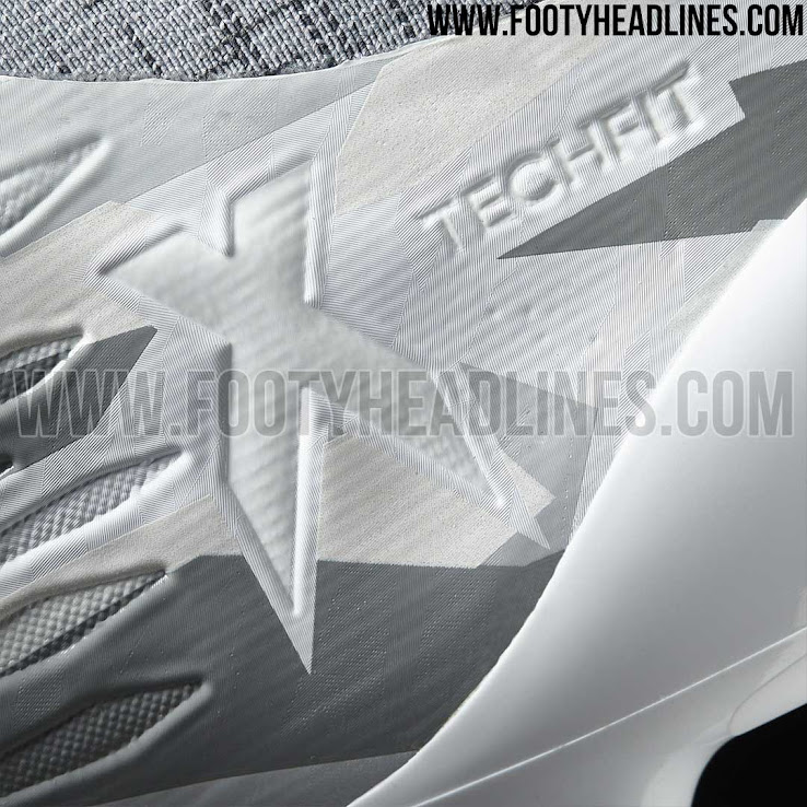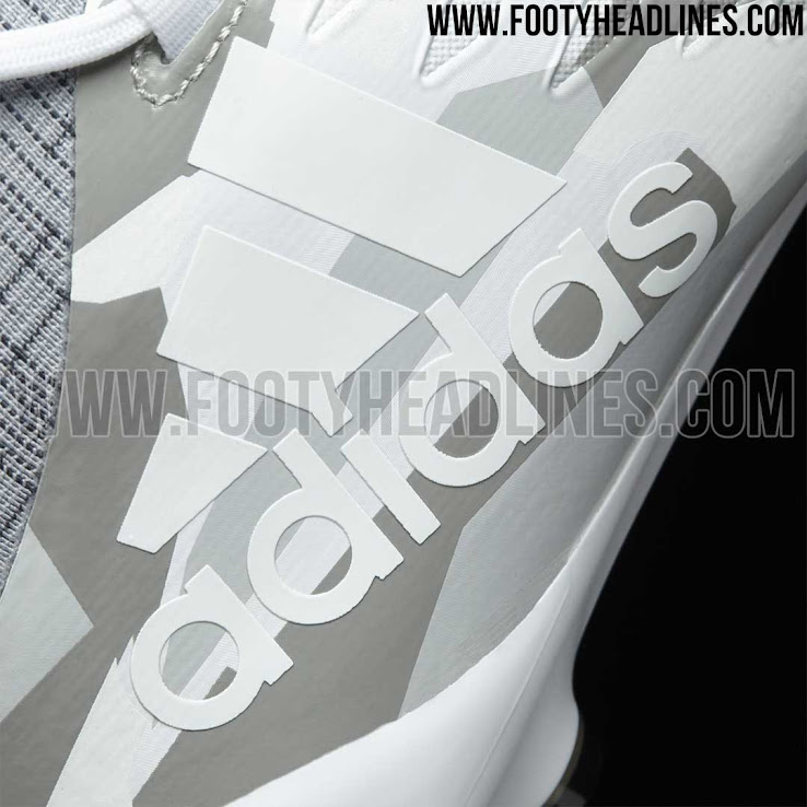 Die neuen Adidas X 16.1 Camouflage Schuhe weisen ein Camouflagemuster im Schneestil in verschiedenen Grau- und Weißtönen auf. Ein tonales Adidas-Performance-Logo sitzt auf der Außenseite der Camouflage Pack Adidas X 16 Fußballschuhe, während die techfit-Socke in einer dunkleren Farbe als das Obermaterial ist.
