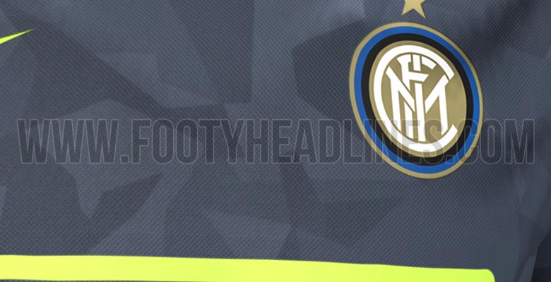 Das Inter 2017-18 Trikot, das einen Camouflagedruck auf dem gesamten Trikot aufweist, ist hauptsächlich dunkelblau, während Gelb für die Sponsoren- und Ausrüsterlogos auf der Vorderseite als auch einen dünnen Streifen, der an der Spitze jedes Ärmels verläuft, vorbehalten wird.