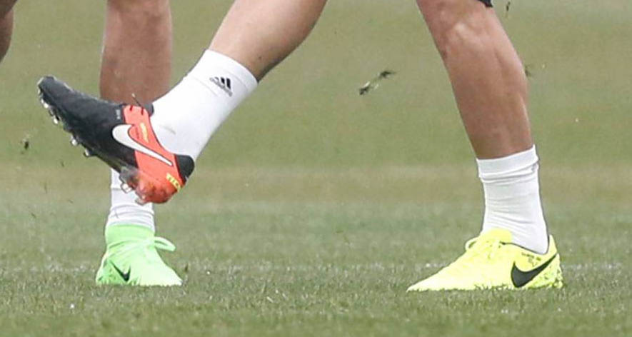 Real-Madrid-Verteidiger Sergio Ramos ragte in der heutigen Trainingseinheit mit einer einzigartigen Fußballschuh-Kombination heraus.