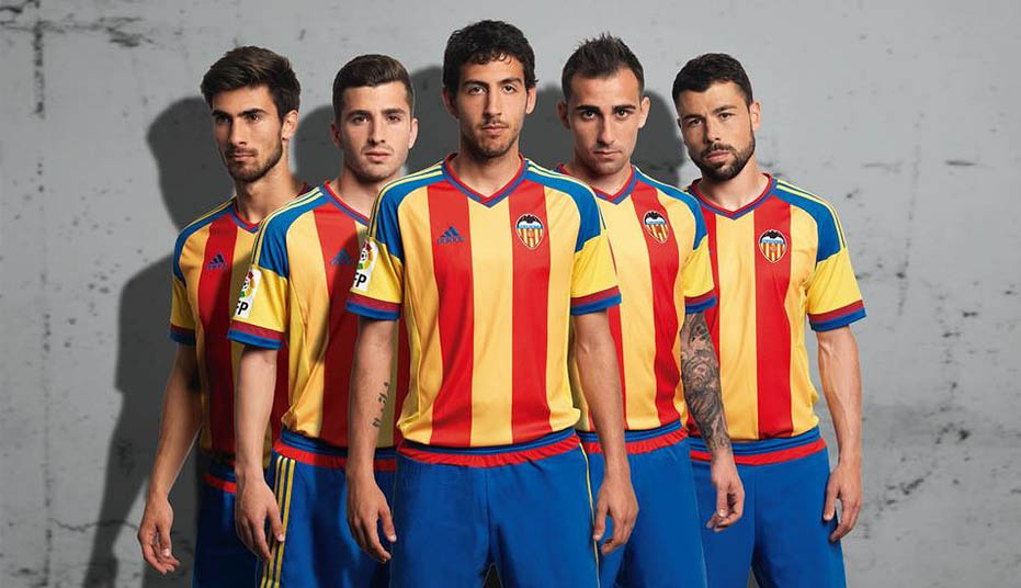 Hier sind einige Valencia-Trikots, die die berühmte Senyera enthielten.