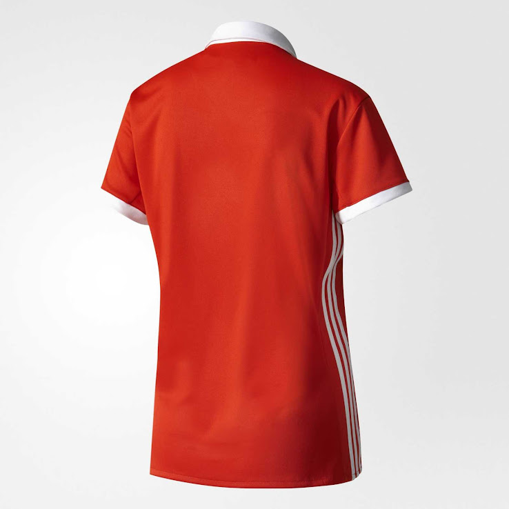 Das Heimtrikot, das ein sehr traditionelles Design hat, ist rot mit einem weißen Polokragen, weißen Ärmelenden und weißen Adidas-Streifen entlang der Seiten. Das Trikot wird mit roten Hosen und Stutzen komplettiert.