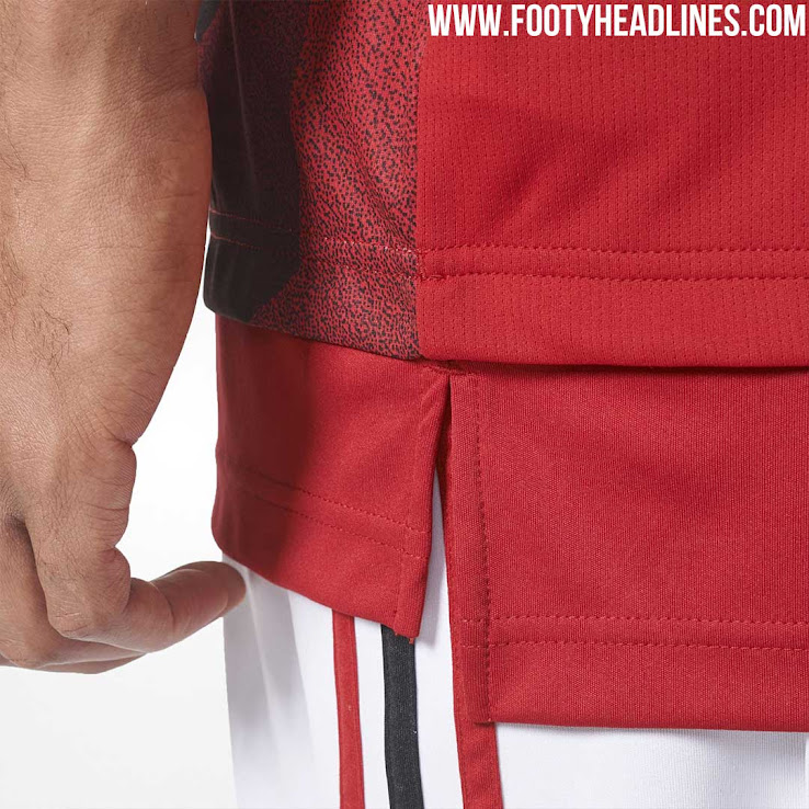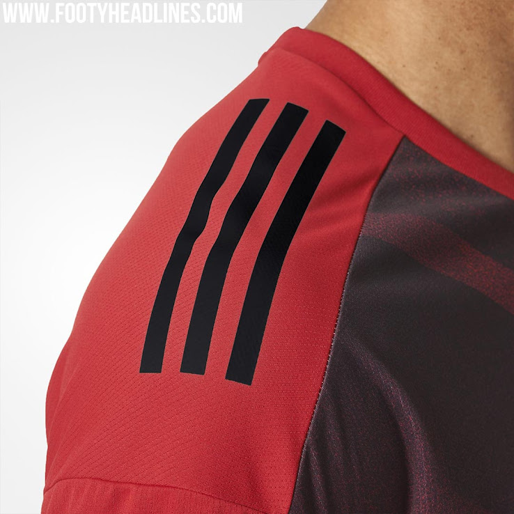 Das neue Milan-Aufwärmtrikot, das von Adidas Lieblingsquelle, ihren eigenen Trikots der 1980er und 90er, inspiriert wurde, ist dunkelrot mit einem auffälligen Grafikdruck, der die gesamte Vorderseite einhüllt. Leider sind die Ärmel, Schultern, der untere Teil und die Rückseite einfarbig rot. Die Drei Streifen sind auf den Schultern platziert.