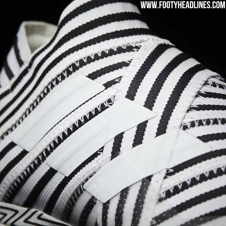 Der Dust Storm Adidas Nemeziz 17+ 360Agility, der eine deutlich unauffälligere Farbzusammenstellung als sein entsprechendes Gegenstück mit Stollen hat, verwirft die gelben Highlights dieses Schuhs und hat anstelle dessen einen sauberen weiß-schwarzen Look. Die subtilen Nemeziz-Schriftzüge der FG-Version wurden auch abgelegt, wobei die Textur auf dem Obermaterial nur aus gleichermaßen breiten weiß-schwarzen Streifen besteht.