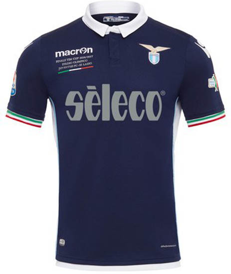 Das besondere Lazio 2016-17 Coppa Italia FInaltrikot, das auf dem modischen 2016-17 Auswärtstrikot basiert, fügt die italienische Trikolore auf den Ärmeln hinzu. Das Trikot setzt auf das TIM-Cup-Logo und das des finalen TIM Cups auf den Ärmeln. Ein weiteres besonderes Feature des neuen Lazio 2017 Coppa Italia Trikots ist, dass die Namen, die Nummern und das Seleco-Logo silber sind.