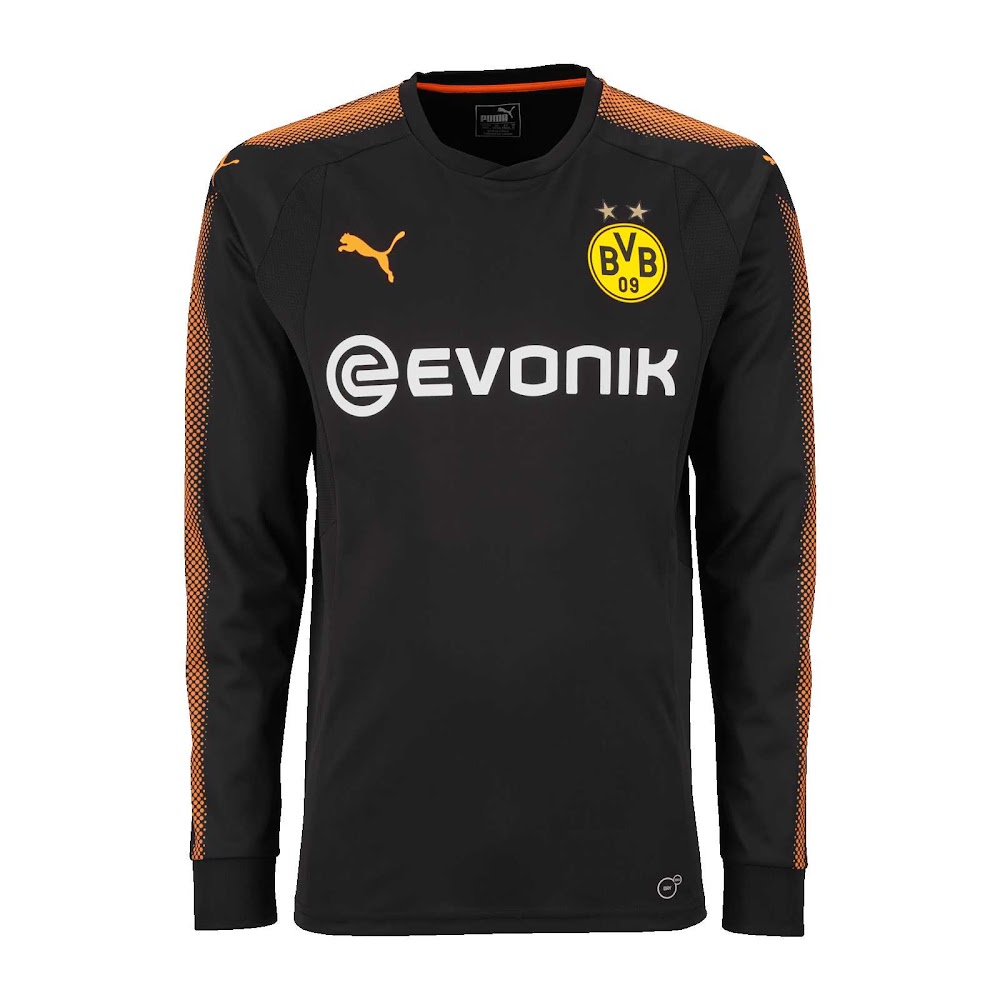 Das neue Torwarttrikot, das auf einem Puma-Template basiert, ist schwarz mit einem tonalen überlappenden Kragen, einem gepunkteten orangen Streifen, der auf jedem Ärmel verläuft und einem orangen Puma-Cat-Logo auf der Brust. Das Evonik-Sponsorenlogo auf der Brust ist völlig weiß.