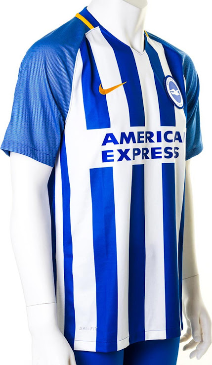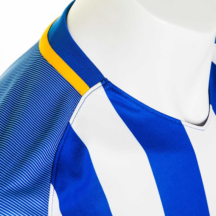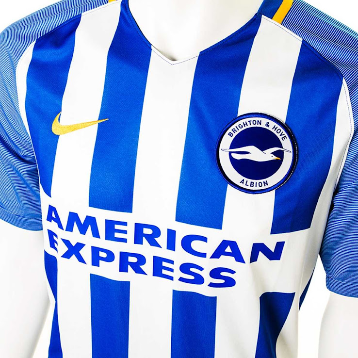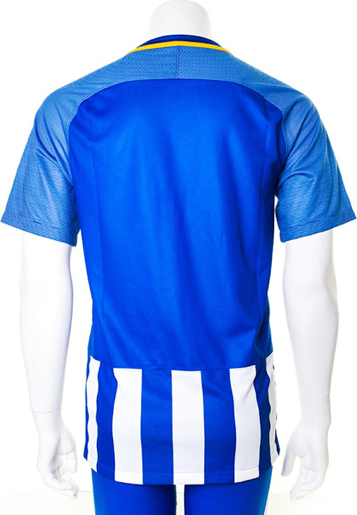 Das neue Brighton-Heimtrikot behält die traditionellen blauen und weißen Streifen auf der Vorderseite bei, wobei die Ärmel und der Großteil der Rückseite einfarbig blau sind. Das Brighton & Hove Albion 17-18 Trikot, das ein exklusives Design für den Klub hat, weist einen gelben Swoosh als auch eine gelbe Linie um die Rückseite des Kragens auf.