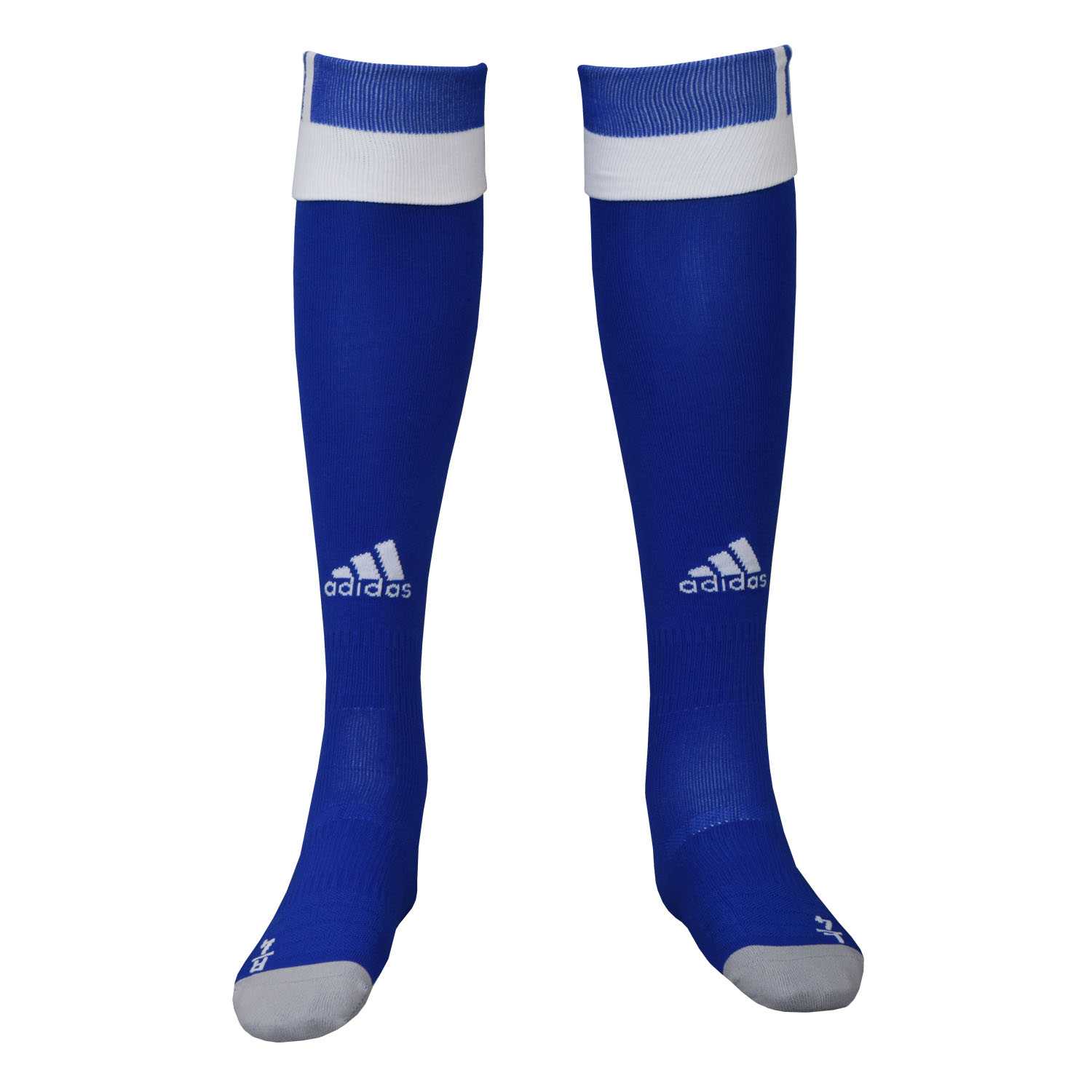 Weiße Hosen und blaue Stutzen komplettieren den Look.