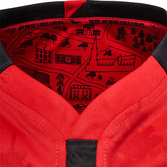 Nachdem das letztjährige SC-Freiburg-Trikot ein auffälliges, schwarz-rotes Streifendesign aufwies, ist das neue Hummel Freiburg 2017-18 Trikot völlig rot mit schwarzen Applikationen. Das Trikot setzt auf einen besonderen Grafikdruck mit wichtigen Sehenswürdigkeiten der Stadt Freiburg innerhalb des Trikotkragens und ein subtiles Tannenbaum-Grafikdesign auf der Vorderseite.