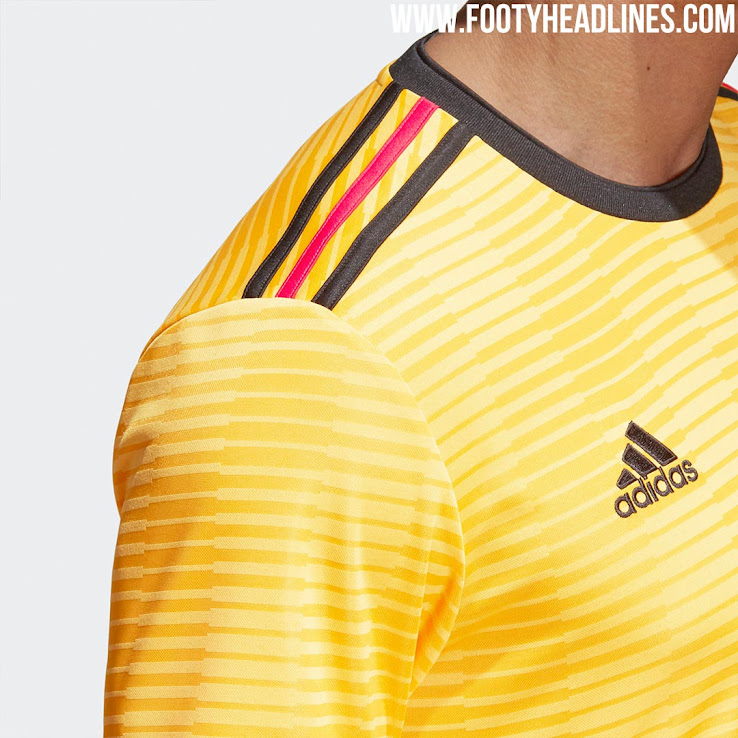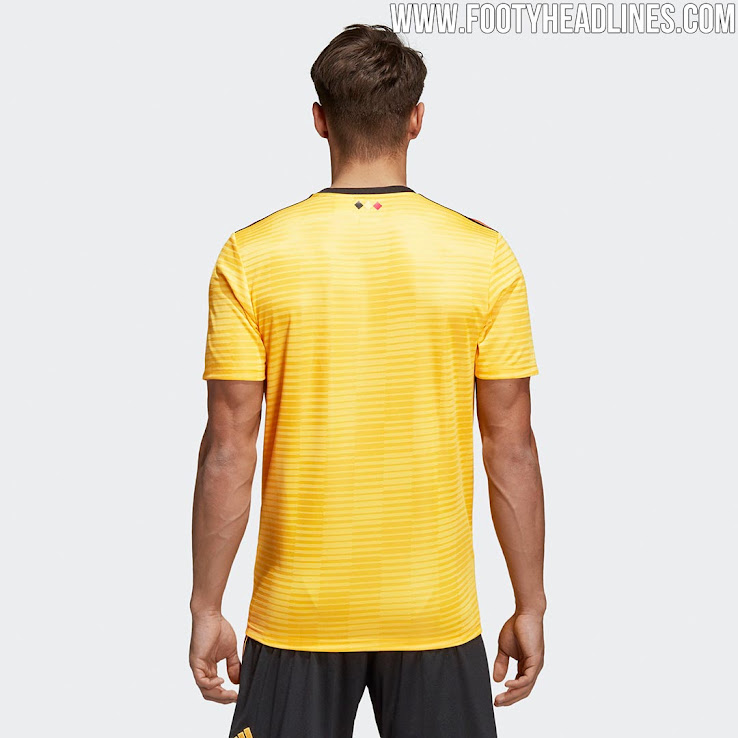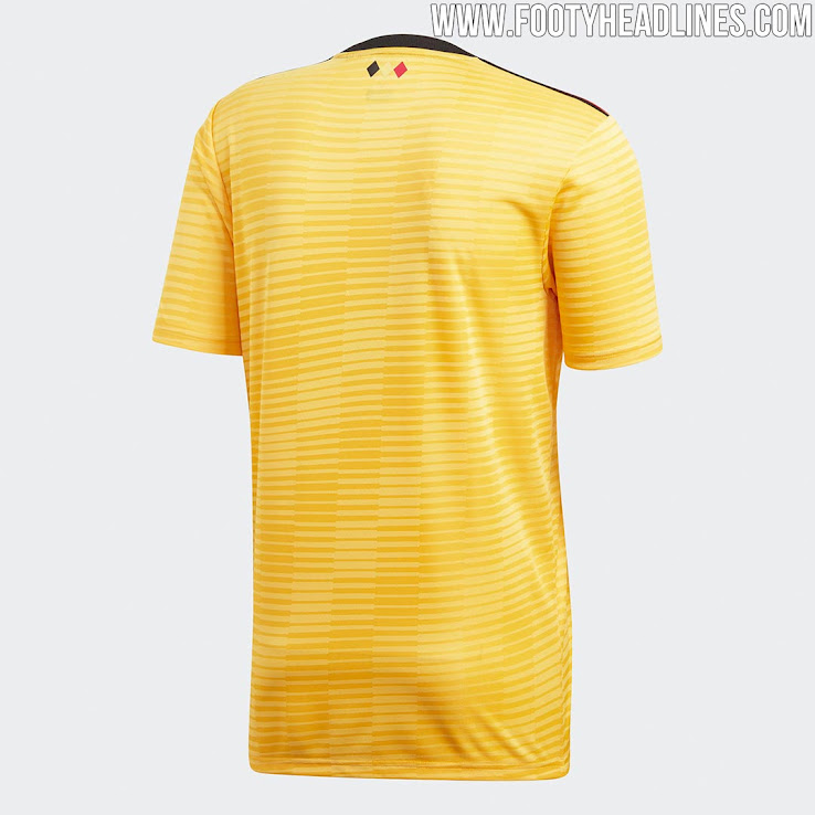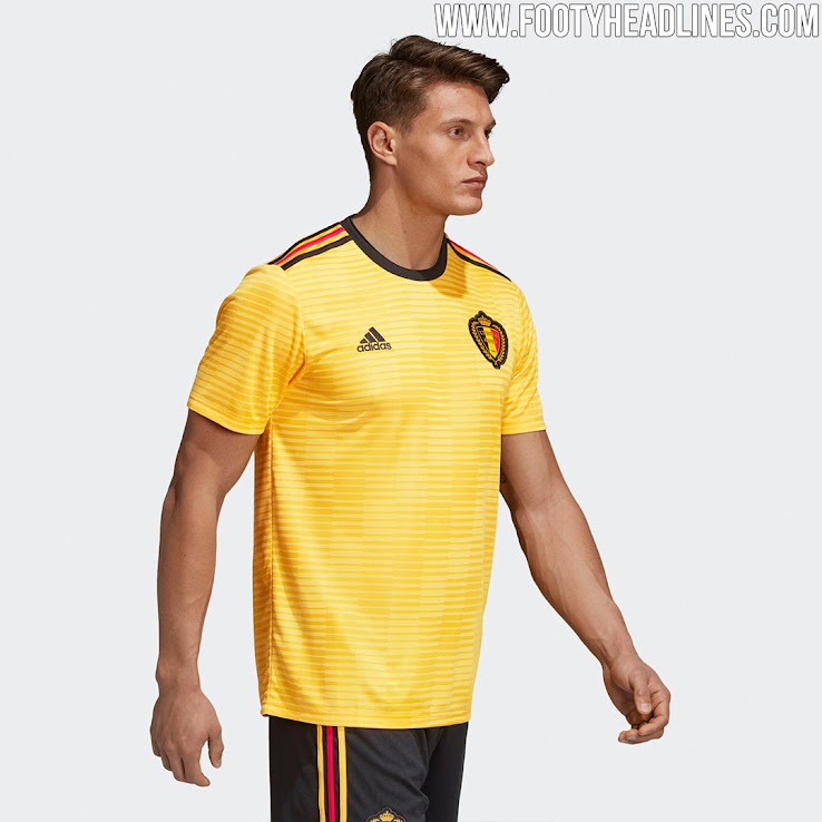 Das Belgien WM 2018 Trikot ist gelb mit schwarzen und roten Details. Während die erstere Farbe für das Adidas-Performance-Logo auf der Brust des neuen Belgien-Auswärtstrikots verwendet wird, taucht Rot in Form des mittleren Streifens von Adidas Markenzeichen auf den Schultern auf.