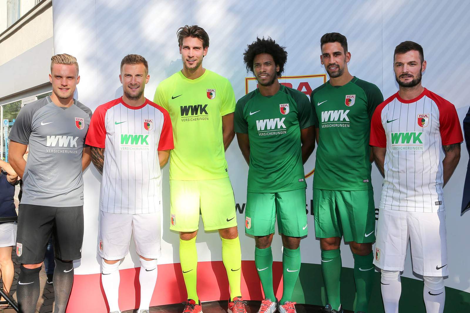 Der Bundesligist FC Augsburg hat diesen Montagabend seine neuen Trikots für die kommende Spielzeit enthüllt. Die neuen Trikots, die wieder einmal von Nike produziert werden, wurden von den Spielern Marcel Heller, Fabian Giefer, Rani Khedira, Caiuby, Daniel Baier und Philipp Max aus der ersten Mannschaft enthüllt.