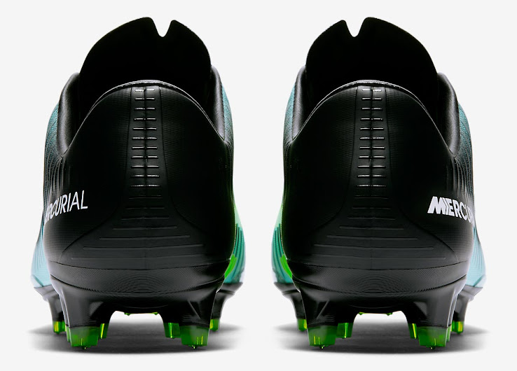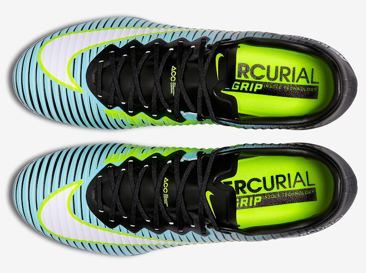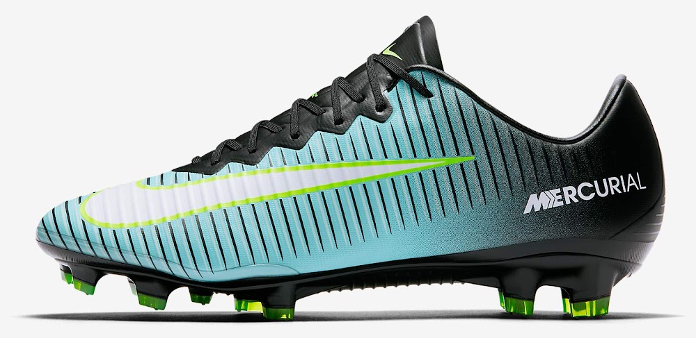 Der neue Nike Mercurial geht von "Light Aqua" im vorderen Teil nach hinten zu Schwarz über. Der große Swoosh vorne ist weiß mit einer gelben Umrandung, ein Detail, das von den Stollen widergespiegelt wird.