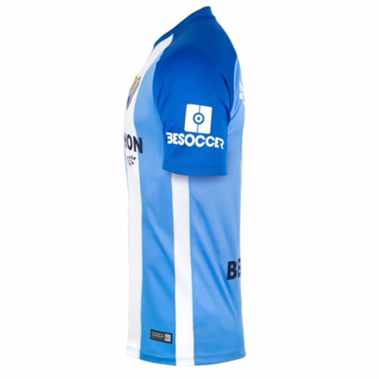 Das Malaga 2017-18 Trikot führt einen sauberen Look mit drei blauen und zwei weißen Streifen auf der Vorderseite und Raglanärmeln in Blau ein. Der Kragen ist ebenfalls blau, von einer runden Art.