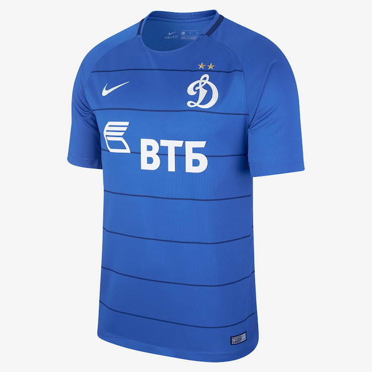 Das neue Dynamo Moskau 2017-18 Trikot, das auf Nikes 2017-18 Template basiert, ist blau mit dunkelblauen Nadelstreifen und weißen Logos.