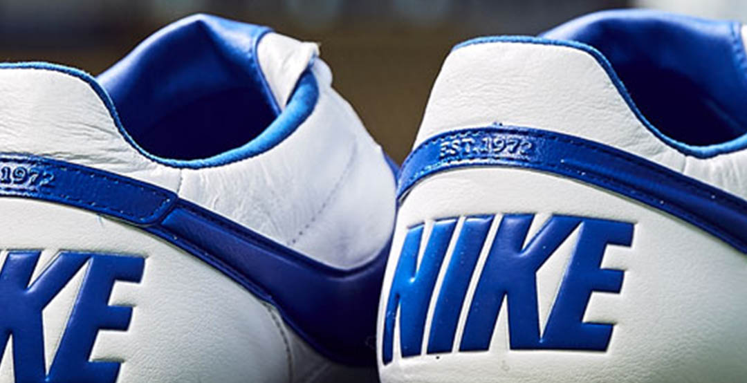 Die dritte Farbvariante des Nike Premier Schuhs wurde von den berühmten weiß-blauen Nike-Tiempo-Farbvarianten der Vergangenheit inspiriert. Die Schuhe kombinieren ein weißes Obermaterial aus Känguruleder mit blauen Applikationen und einer blauen Außensohle.