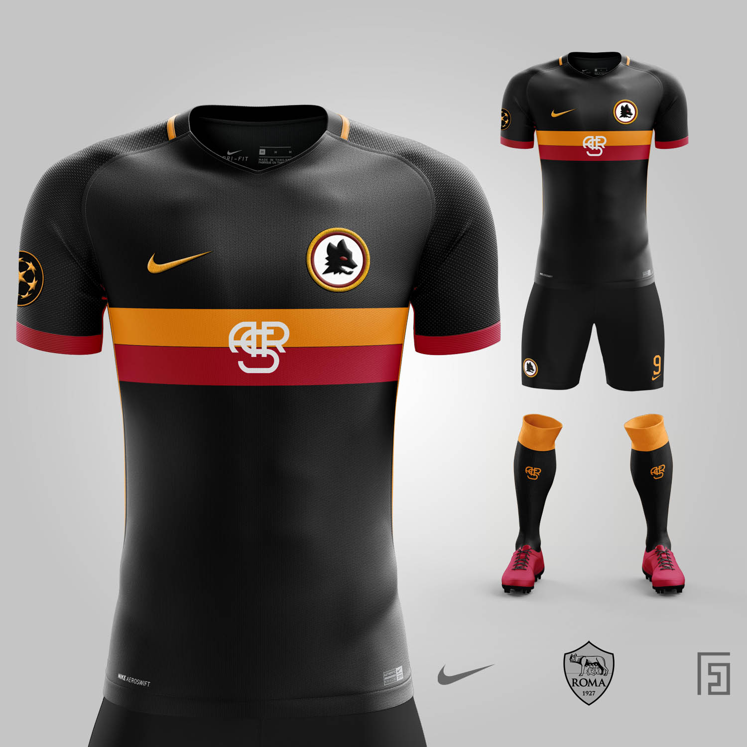 Das AS Rom Konzepttrikot von FC Design, das wahrscheinlich schönste Design, kombiniert Nikes modernes Aeroswift-Template mit Romas klassischem "i lupi"-Wappen.