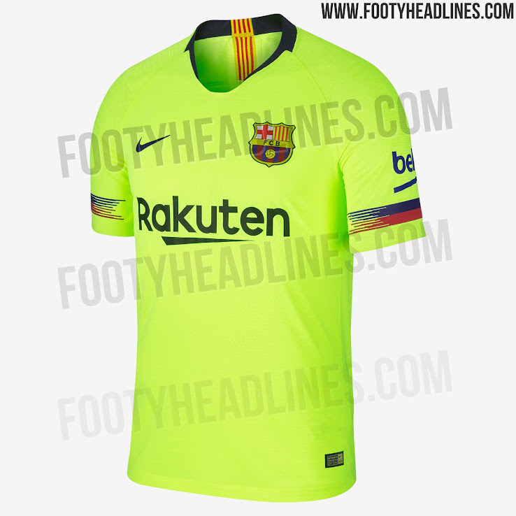 Das neue FC Barcelona 2018-2019 Trikot ist hauptsächlich knallgelb mit dunkelblauen und dunkelroten Details. Der Kragen des Barcelona 18-19 Trikots, das auf dem Vapor Aeroswift Template basiert, ist dunkelblau mit einer katalanischen Flagge auf der Rückseite.