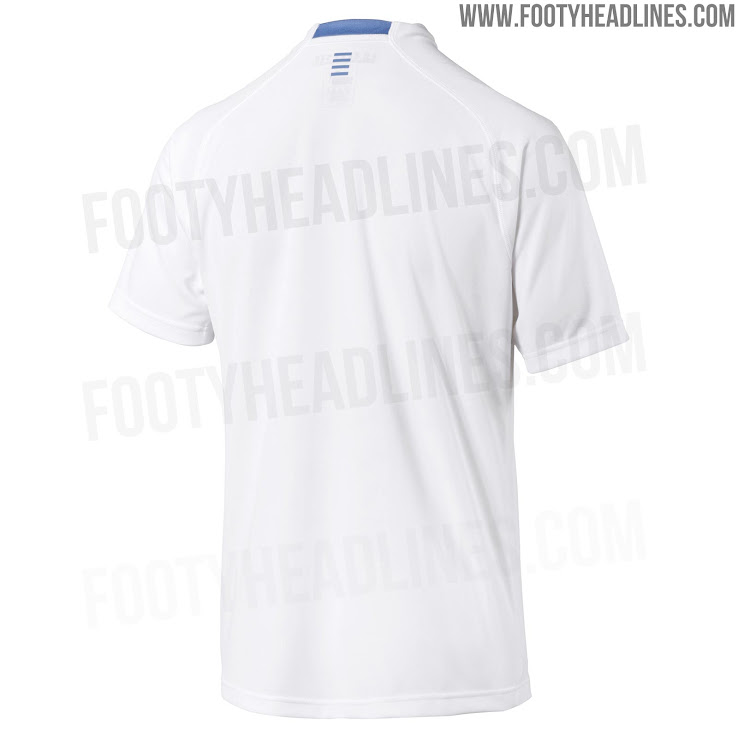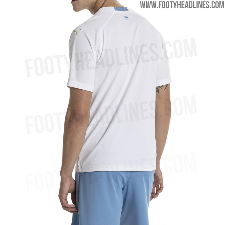 Das Uruguay WM 2018 Trikot, das keines ist, das extreme Gefühle in beide Richtungen erzeugt, ist weiß mit goldenen Puma-Logos und himmelblauen Details auf dem Nacken.