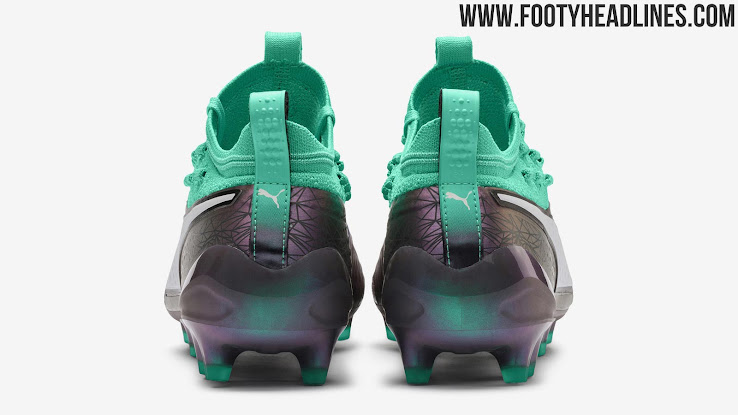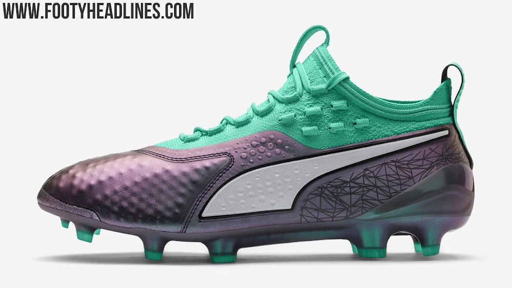 Die neuen Puma ONE WM 2018 Schuhe, die ein Color-Blocking-Design haben, sind hauptsächlich lila / silber mit einem weißen Formstreifen auf der Seite und einer blaugrünen Socke. Ein subtiler geometrischer Grafikdruck taucht im Fersenbereich auf.