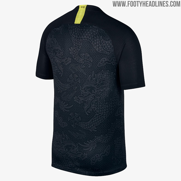 Die dunkle Grundlage des Nike China 2018 Trikots vervollständigen gelbe Akzente in Form des Swoosh auf der rechten Brust, einem einfarbigen Verbandswappen auf der anderen Seite und einer Drachengrafik im Inneren des Kragens.