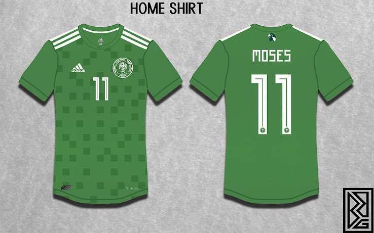 Das Heimtrikot der nigerianischen Nationalmannschaft ist grün mit einem chaotischen Muster aus Vierecken. Das Auswärtstrikot hat ein ähnliches Design in Weiß mit grünen Details.