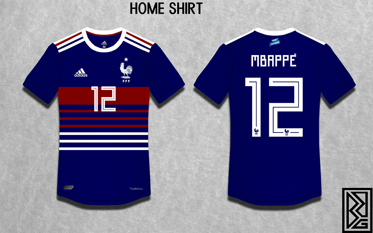 Das Heimtrikot sieht sehr interessant aus. Abhängig von deinem Alter könnte es Erinnerungen an das 1984 Frankreich-Heimtrikot oder das 1998-Trikot wecken. Das Auswärtstrikot ist hauptsächlich weiß mit blauen und roten Details.