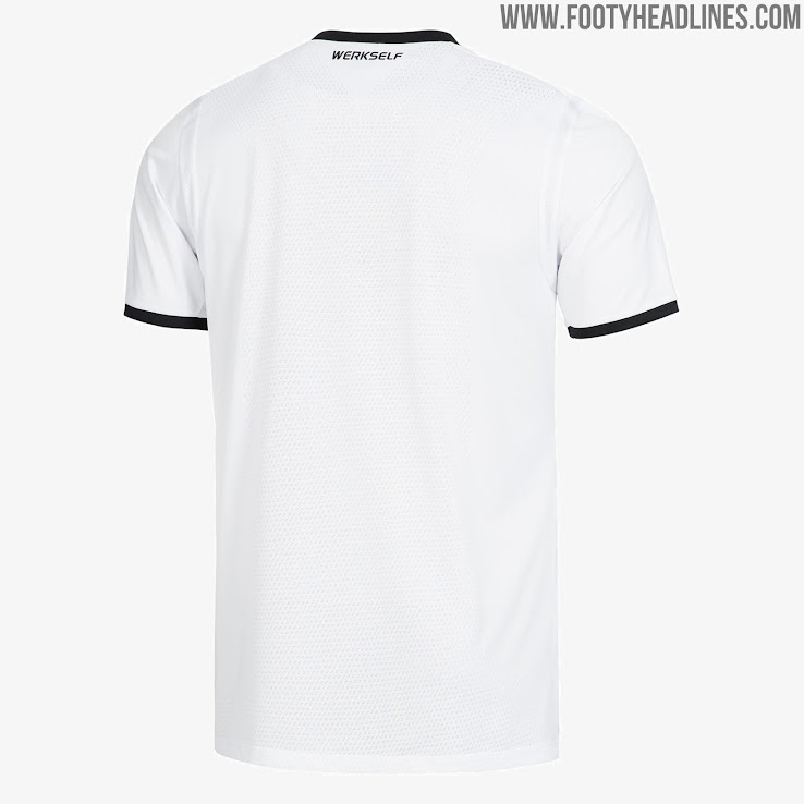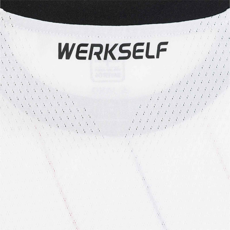 "Werkself" steht auf der Rückseite des Nackens in einer Schriftart, die von historischen Bayer-04-Logos stammt, geschrieben.