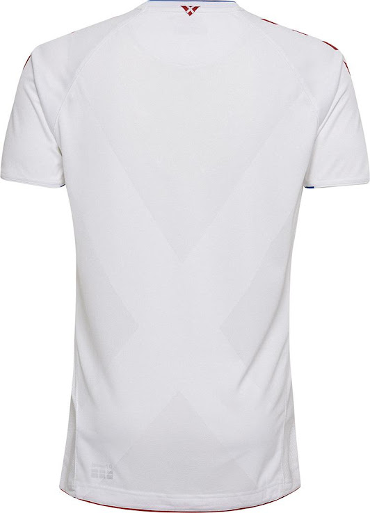 Das zweite Hummel Dänemark WM 2018 Trikot, das auf dem gleichen Template basiert, ist weiß mit roten Logos und blauen Details auf dem Nacken und den Ärmelenden. Es setzt auf all die gleichen verschachtelten Details wie das Heimtrikot.