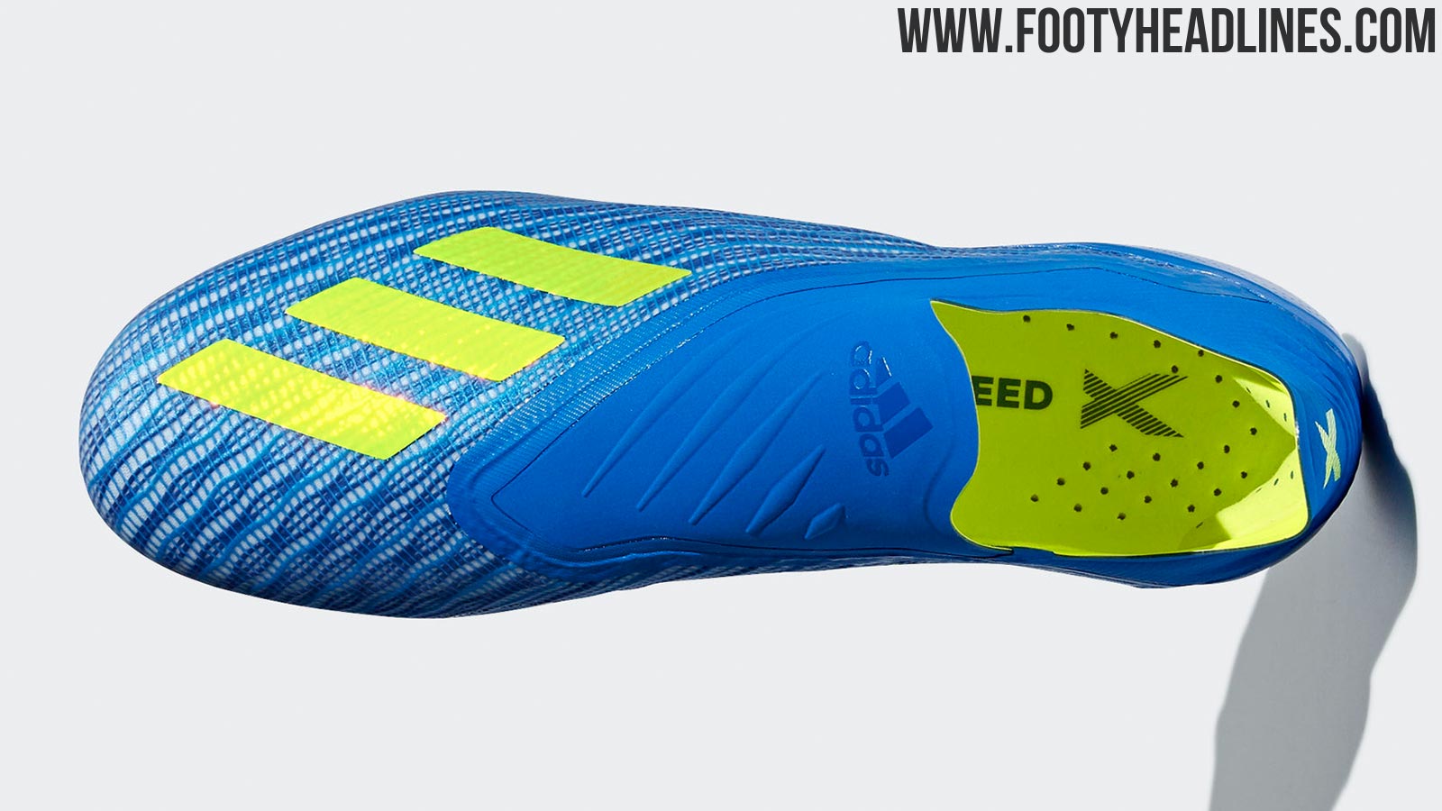 Die Adidas X 18+ Schuhe, die ähnlich wie der klassische Adidas F50 Adizero für ultimative Geschwindigkeit entwickelt wurden, sind die allerersten schnürsenkellosen Adidas X Fußballschuhe. Die Schuhe weisen ein minimalistisches, leichtgewichtiges Design und eine Speedframe-Sohle für sofortige Beschleunigung auf.