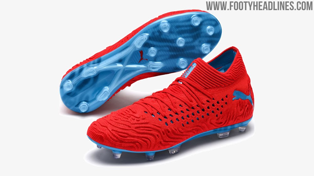 Die Außensohle, die mit der ersten und zweiten Generation identisch ist, ist komplett blau, während die Oberseite der Puma Future 2019 Netfit Fußballschuhe rot mit leuchtend blauen Aufschriften ist.