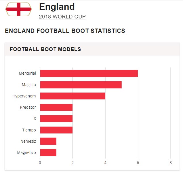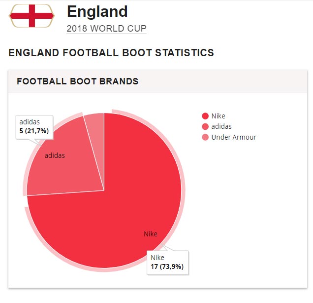 Der England-Kader für die WM 2018 wird stark vom Swoosh dominiert, der die Schuhe für 17 der 23 nominierten Spieler herstellt. Adidas hat nur fünf Spieler unter Vertrag (Dele Alli, Phil Jones, Jesse Lingard, Ruben Loftus-Cheek & Danny Welbeck), während Under Armour die Schuhe für Trent Alexander-Arnold herstellt.