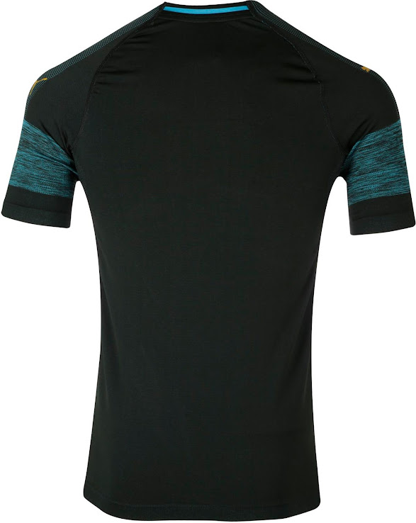 Olympique Marseilles zweites 2018-19 Trikot ist schwarz mit einem himmelblauen Melangestreifen auf den Ärmeln. Das Puma-Logo auf der Vorderseite ist golden.