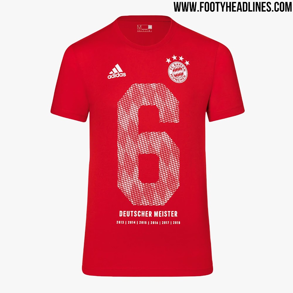 Die Bayern München 2018-19 Meisterkollektion enthält drei T-Shirts, wobei sich eins durch ein recht billiges Sixpack-Motiv auszeichnet. Der Klub wird das rote Shirt von Adidas mit der 6 auf der Vorderseite für ihre Titelfeierlichkeiten verwenden. Die zwei anderen T-Shirts wurden vom Klub entworfen.