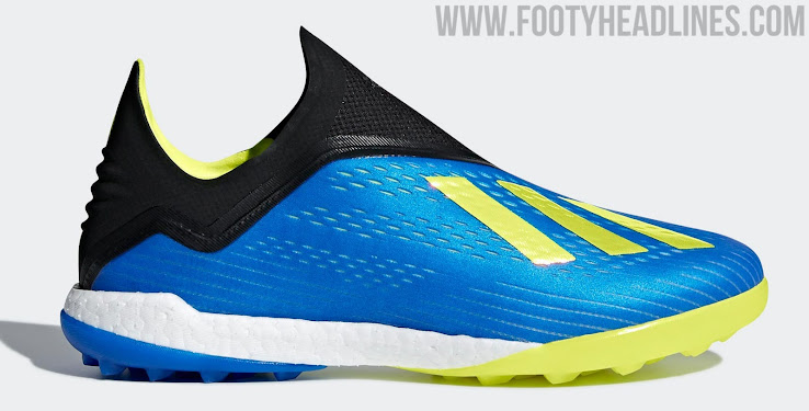 Der schnürsenkellose Adidas X 18+ Fußballschuh ist auch als Hallen- und Hartplatzversion für Kleinfeldfußball erhältlich. Das Design der Schuhe ist eine Mischung der schnürsenkellosen und Schnürsenkelversion der Reihe.