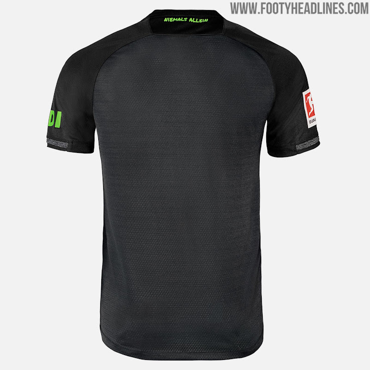 „Fast alle von uns haben im Kindesalter auf Bolzplätzen und Hinterhöfen mit dem Fußballspielen angefangen – in Erinnerung daran der Grau-Melange-Look auf dem schwarzgehaltenen Auswärtstrikot. Der Weg von dort führt in die Vereine, wo auf sattem Grün gekickt wird – darauf spielt das Ausweichdress an, das wir bewusst grell und auffällig gestaltet haben.