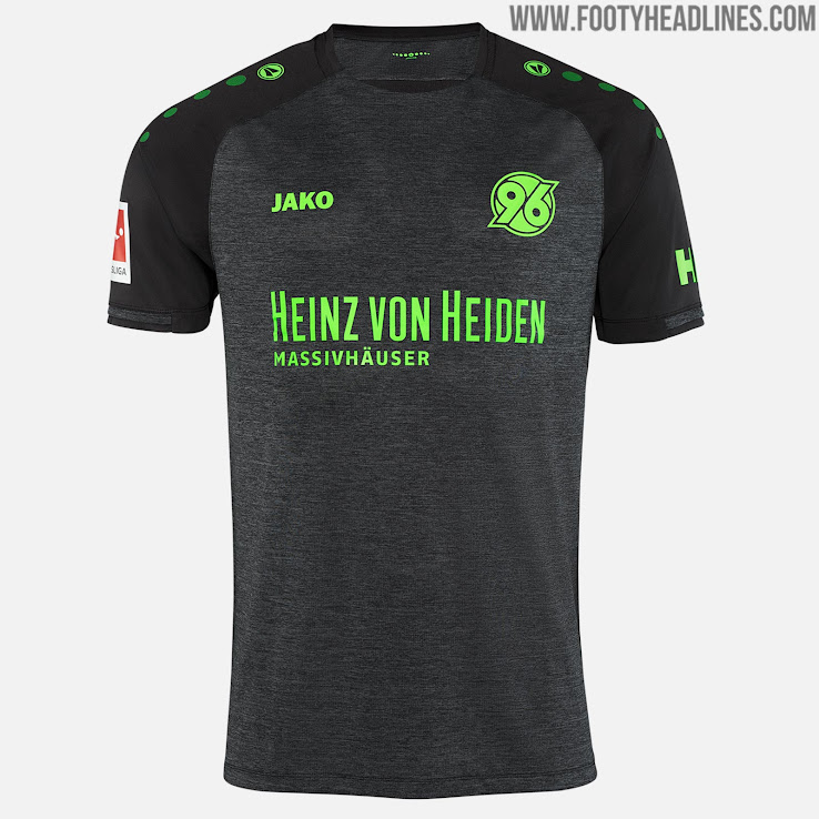 Das neue Hannover-96-Auswärtstrikot für die Saison 2018-2019 weist einen grauen Melangelook auf. Es setzt auf auffällige grüne Applikationen und Logos.