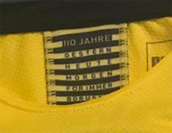 Innerhalb des Kragens befindet sich ein besonderes Label mit dem Text "110 Jahre. Gestern. Heute. Morgen" - der BVB feiert sein 110-jähriges Bestehen im Dezember 2019. Der Verein wurde 1909 gegründet.