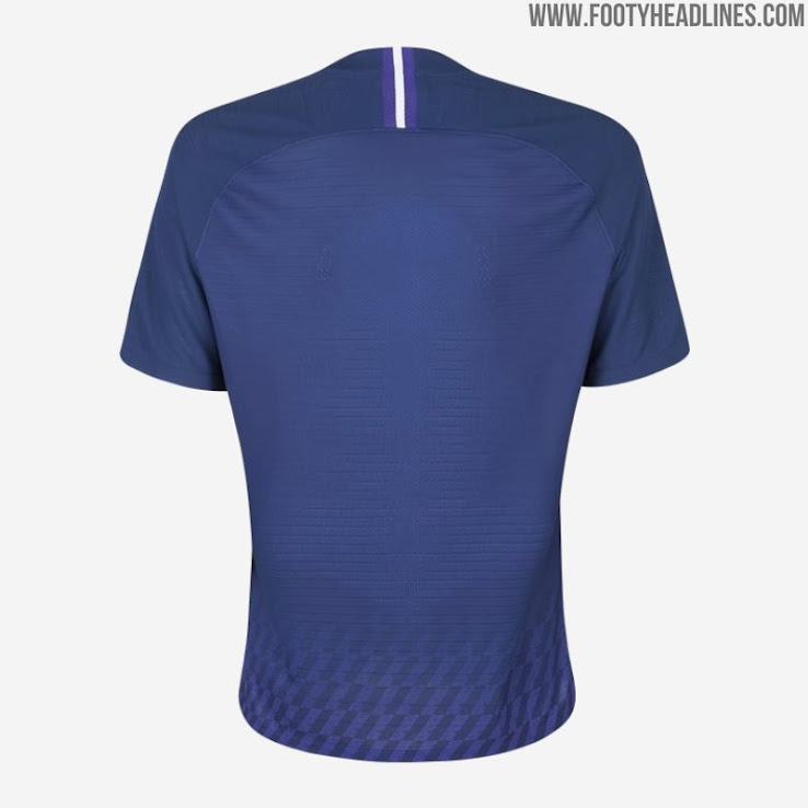 Das Tottenham 2019-20 Trikot ist überwiegend dunkelblau mit weißen Logos. Interessanterweise verläuft ein subtiles Farbverlaufsmuster in Lila auf der Brust.