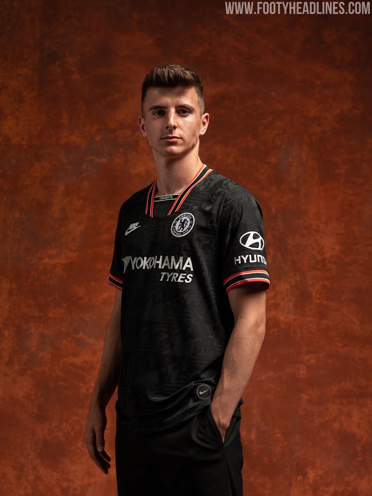 Das Chelsea 2019-20 Trikot ist überwiegend schwarz mit orangen und weißen Details. Die Logos sind weiß, darunter ein farblich verändertes Vereinswappen auf der rechten Brust.