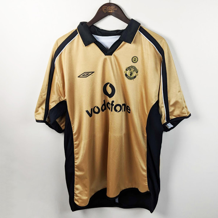 ManU veröffentlichte 2001-02 ein goldenes Wappen, um ihren 100. Geburtstag zu feiern. Das Replikatrikot war umkehrbar; Gold & Weiß.