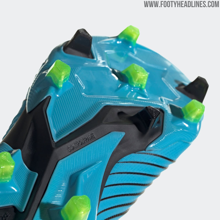 Die neuen Adidas Predator 2019-20 Fußballschuhe sind überwiegend "Bright Cyan" mit schwarzen Akzenten und leuchtend gelben Details. Schwarz wird für die Socke, die Drei Streifen und Teile der Außensohle verwendet, während ein leuchtendes Gelb für den Schriftzug "Control Skin" und das Predator-Logo im Inneren verwendet wird.
