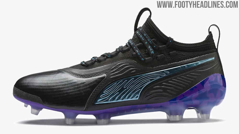 Die neuen Puma ONE "MVP" Fußballschuhe sind überwiegend schwarz mit einem metallisch bläulich-grauen Formstripe-Branding auf der Außenseite und einer schlichten Innenseite. "MVP 2019" steht auf den Schnürsenkeln geschrieben, während ein Sternenmuster und ein großer "MVP"-Schriftzug die Außensohle zieren, die links orange und rechts lila ist.
