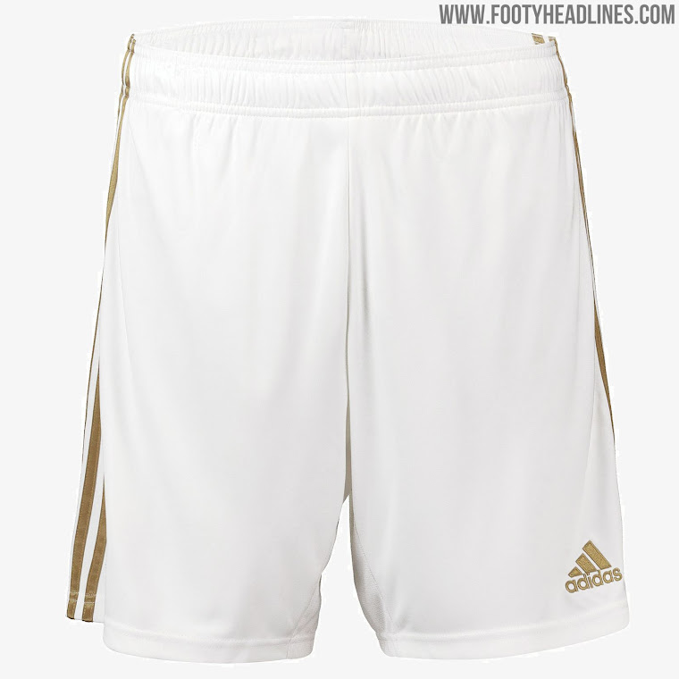 Weiße Hosen und Stutzen mit goldenen Logos und Streifen komplettieren das Real Madrid 19-20 Trikot.