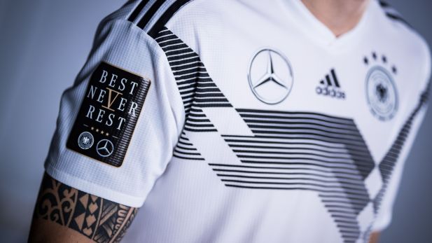 Mercedes war seit 46 Jahren Sponsor der deutschen Nationalmannschaft. Sie veröffentlichten ein spezielles Mash-up-Trikot, um sich von der deutschen Nationalmannschaft zu verabschieden.