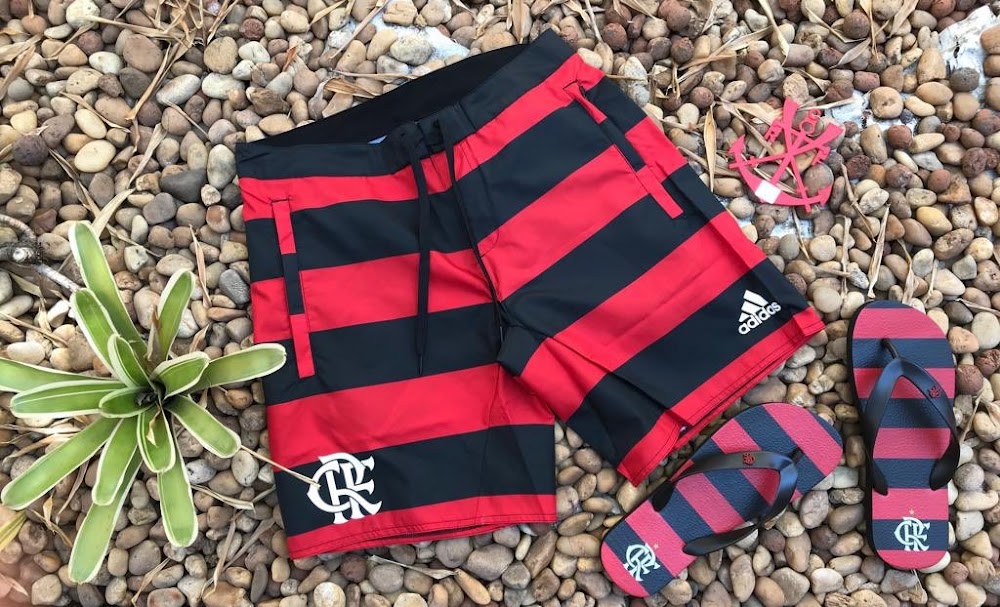 Die Adidas Flamengo Strandkollektion besteht aus Hose und Adiletten (Schuhe). Die Kollektion trägt die traditionellen Farben des Klubs, mit rot-schwarzen horizontalen Streifen und einem weißen Adidas-Logo.