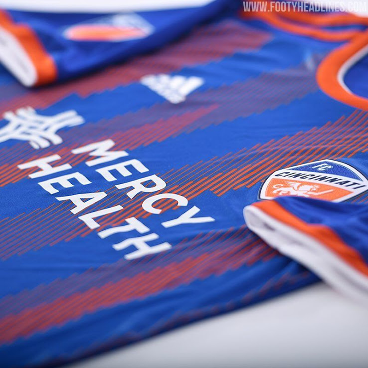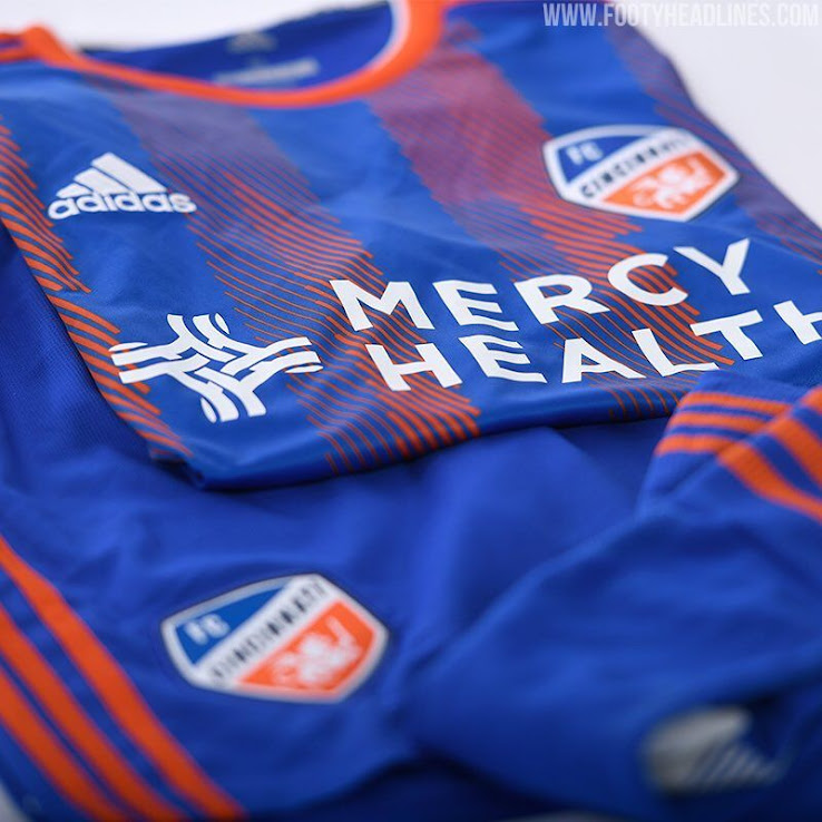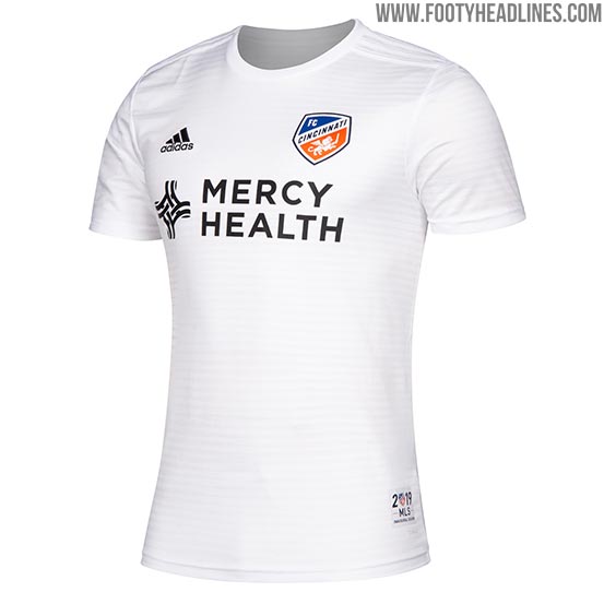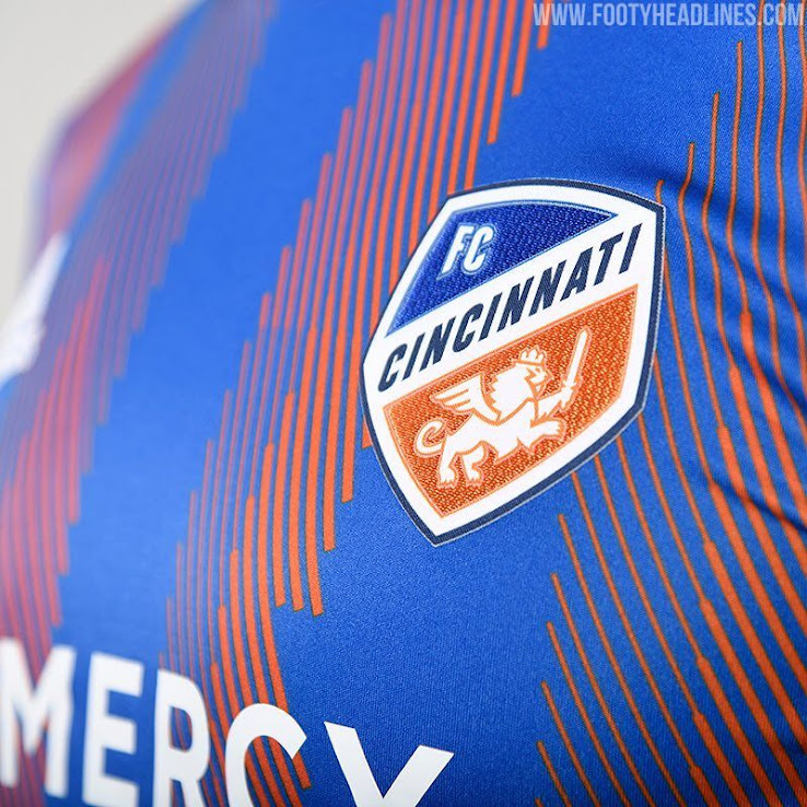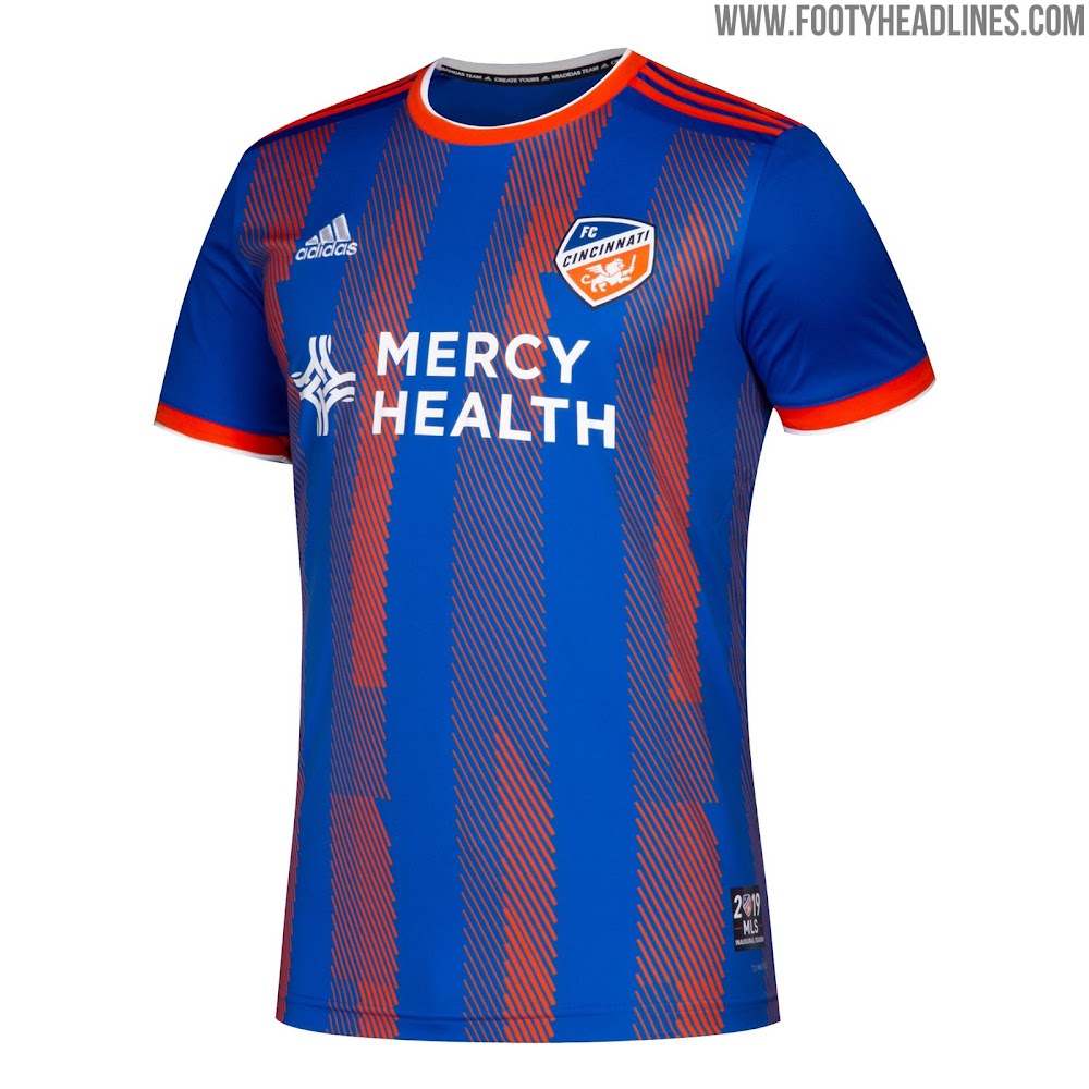 Mercy Health wird prominent in Weiß auf der Brust des ersten MLS-Heimtrikots des FC Cincinnati stehen - überlagert auf dem Streifenmuster. Das Wappen der Mannschaft prangt über dem Herzen des Spielers und ist mit einem speziellen Metallfaden für die allererste Saison versehen. Ein spezielles Jock-Tag auf dem linken Saum zeigt "2019 Inaugural Season", wobei die 0 im Jahr 2019 durch das Vereinswappen ersetzt wurde.