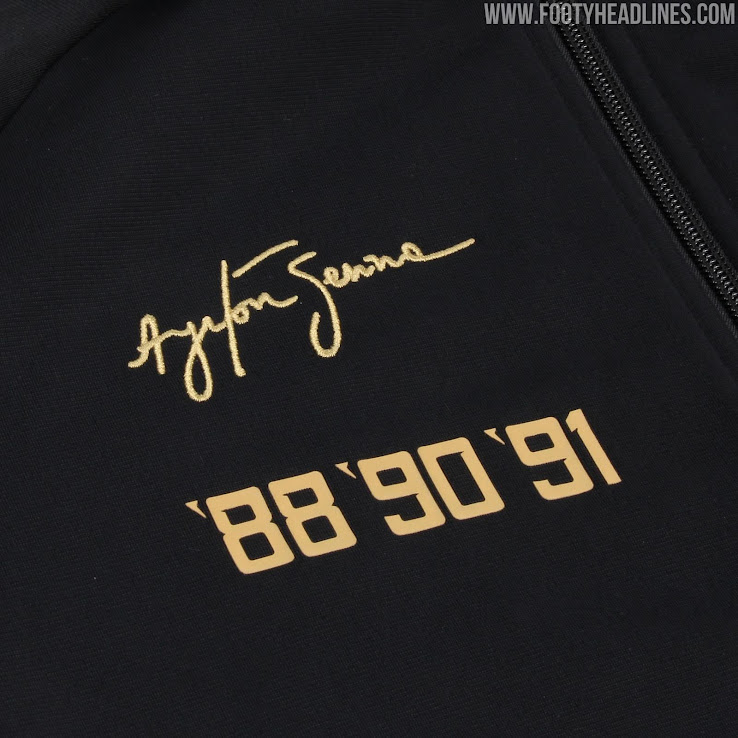 Konkret feiert die neue Jacke Sennas Hattrick der Formel-Meisterschaften zwischen 1988 und 91. Deshalb finden wir auf der rechten Brust, unter einer Nachbildung seiner Unterschrift, die Jahre der Titel in goldener Schrift.
