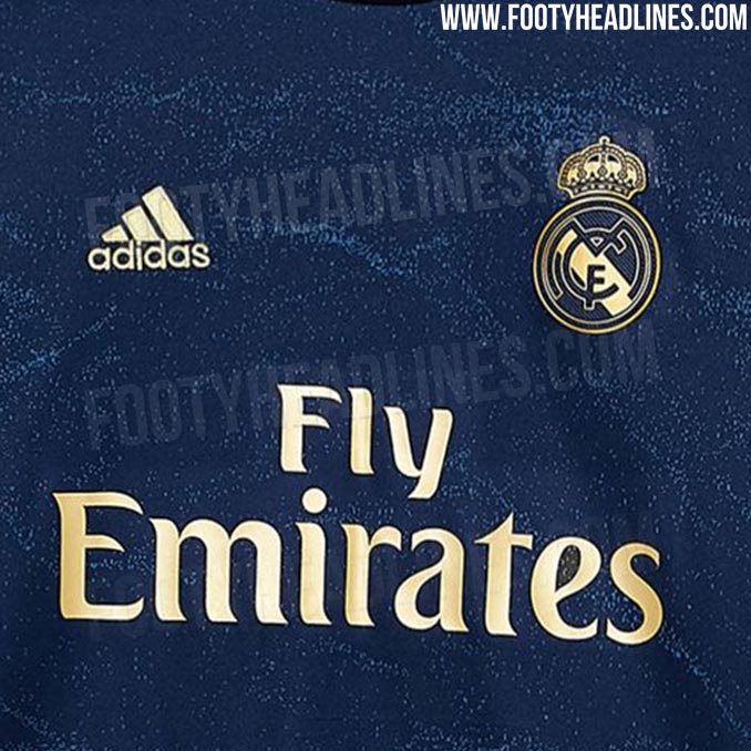 Das Adidas Real Madrid 2019-2020 Trikot ist dunkelblau mit goldenen Applikationen. Die Vorderseite hat einen von der Galaxie inspirierten Druck.