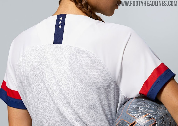 Das USA Frauen-WM 2019 Trikot ist überwiegend weiß mit mutigen roten und blauen Enden, wobei die gleichen Farben für Details auf Vorder- beziehungsweise Rückseite des Kragens verwendet werden. Der Swoosh auf der rechten Brust des USA-Heimtrikots ist rot mit einer blauen Umrandung und das von drei Sternen begleitete USA-Logo sitzt auf der gegenüberliegenden Seite.