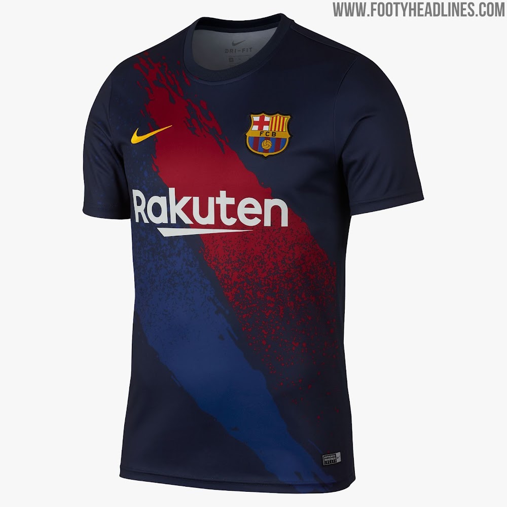 Auf Grundlage des ziemlich standardmäßigen, neuen Nike-Templates für Aufwärmtrikots ist das Barcelona-Trikot dunkelblau mit einer blau-roten Spritzgrafik auf Vorder- und Rückseite. Der Swoosh, der auf der rechten Brust des Barcelona 2019-20 Aufwärm-Trikots sitzt, ist gelb, während das Rakuten-Logo weiß ist.